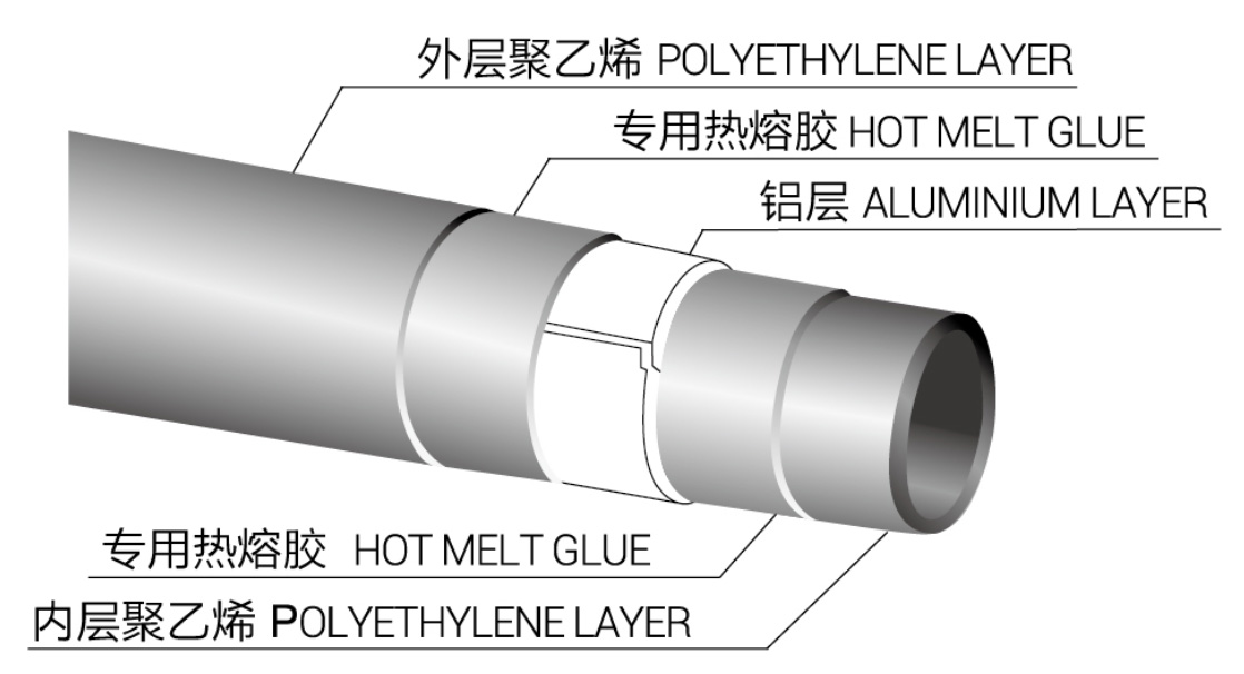 奇愛(ài)牌鋁塑聚乙烯(PE)管材采用搭接法生產(chǎn)工藝生產(chǎn),由中間鋁管、 內(nèi)外層P E以及鋁管P E之間的熱熔膠共擠而成的復(fù)合管材,管道采用卡套式銅配件進(jìn)行連接。